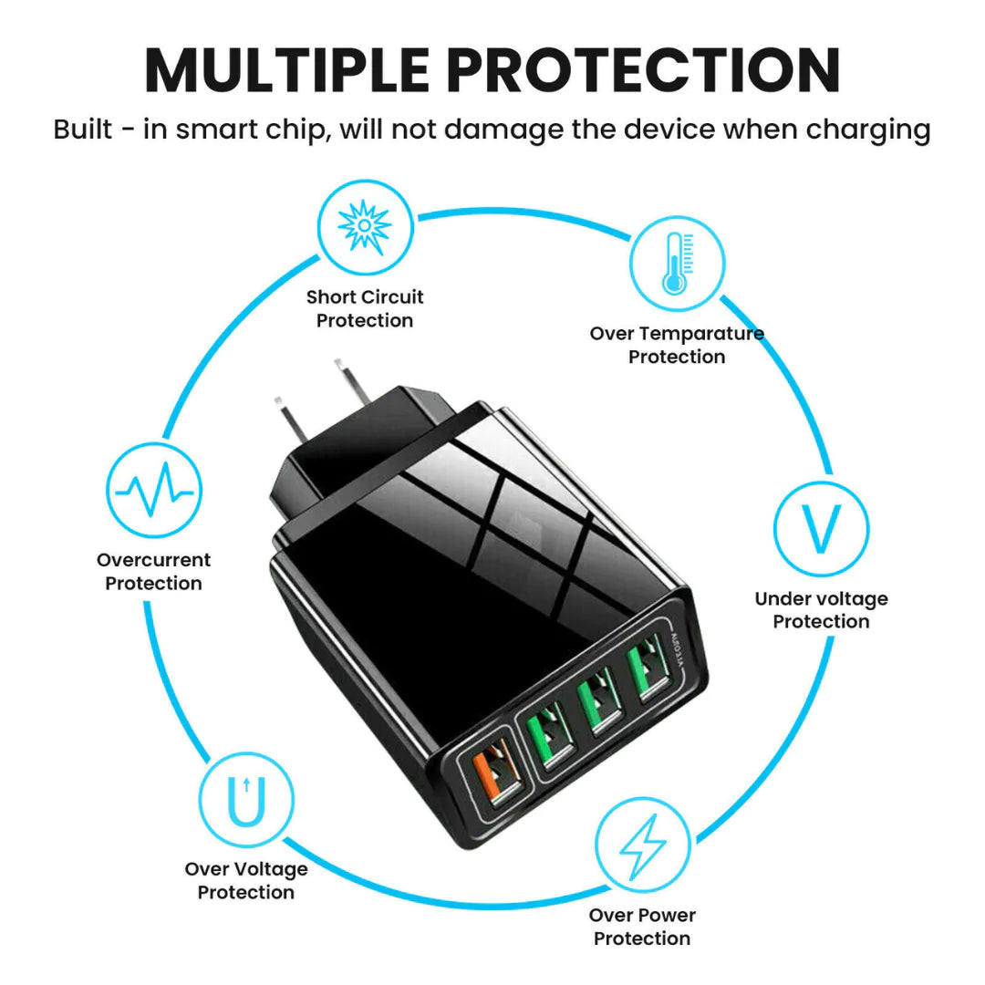 【4 USB Ports 】Fast charge 3.0 and 4 USB ports 5V/ A max. Load 4 devices at the same time.